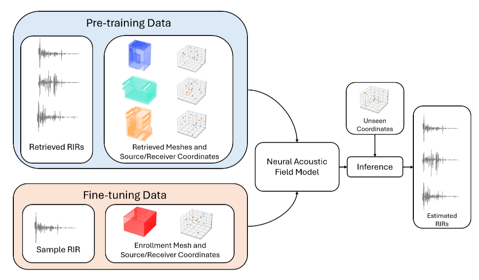 The GenDARA challenge aims to promote the use of generative AI to synthesize RIRs from limited room data, as collecting or simulating RIR datasets at scale remains a significant challenge due to high costs and trade-offs between accuracy and computational efficiency. The challenge asked participants to first develop RIR generation systems capable of expanding a sparse set of labeled room impulse responses by generating RIRs at new source–receiver positions. They were then tasked with using this augmented dataset to train speaker distance estimation systems. Ranking was determined by the overall performance on the downstream SDE task. MERL’s approach to the GenDARA challenge centered on a geometry-aware neural acoustic field model that was first pre-trained on a large external RIR dataset to learn generalizable mappings from 3D room geometry to room impulse responses. For each challenge room, the model was then adapted or fine-tuned using the small number of provided RIRs, enabling high-fidelity generation of RIRs at unseen source–receiver locations. These augmented RIR sets were subsequently used to train the SDE system, improving speaker distance estimation by providing richer and more diverse acoustic training data.