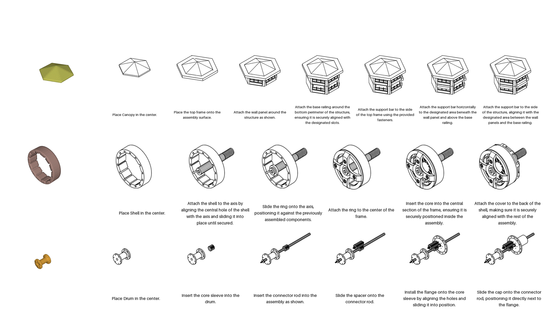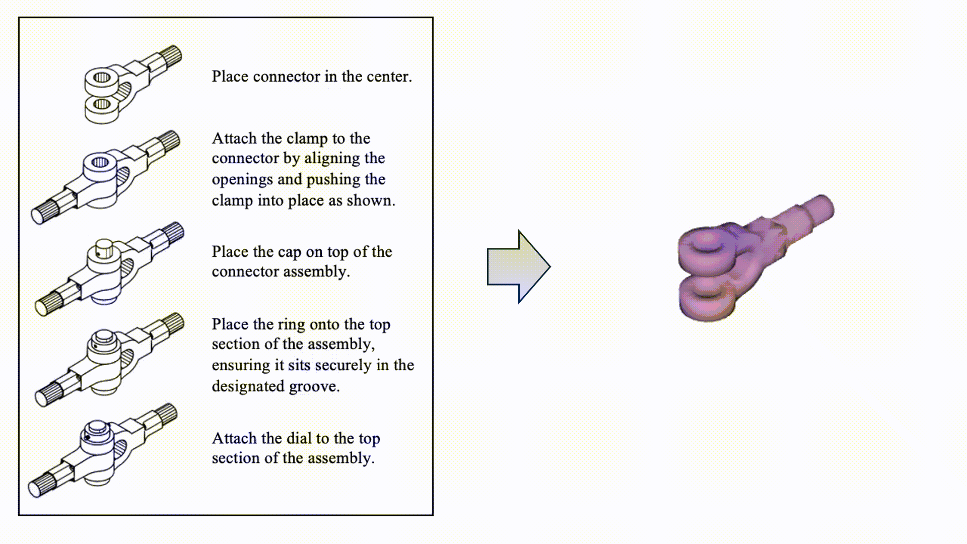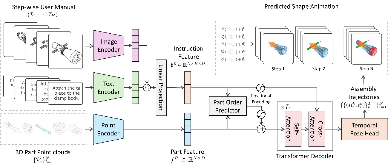 In this work, we consider the problem of assembling complex industrial objects that have parts of varied shapes, sizes, and need intricate maneuvers for assembly. Given a stepwise manual with diagrams and text as shown on the left, we aim to assemble the corresponding set of 3D parts, which are represented as 3D point clouds, in a physics engine-based virtual environment, outputting its stepwise assembly trajectories, which can be rendered into 4D animations as shown on the right.
