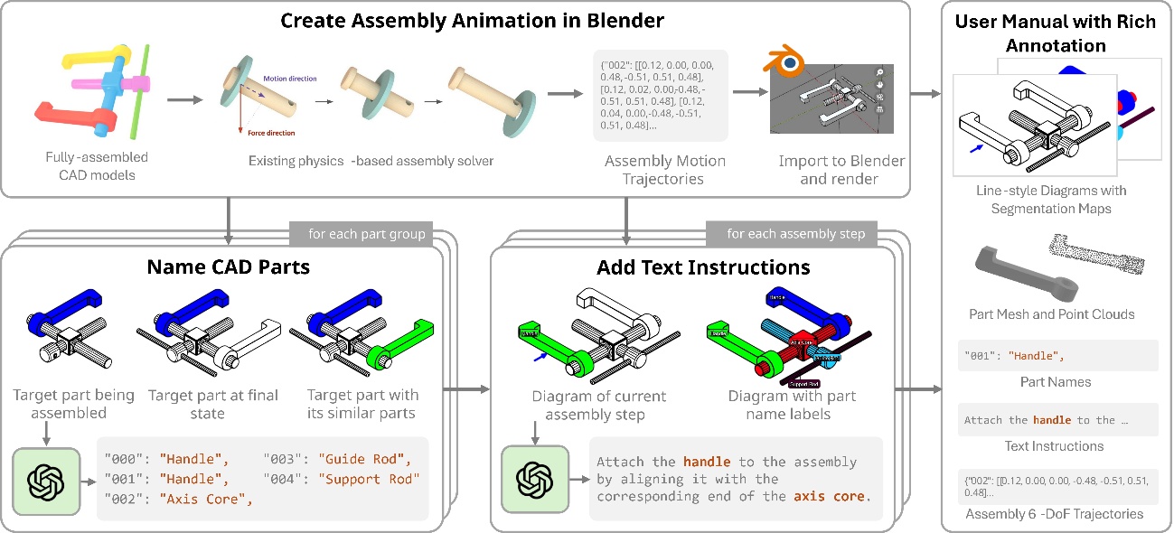 The dataset is created by our automated instruction manual generation pipeline. From a CAD model of an assembled object, we find the part assembly trajectories using a physics engine, then import the animations to Blender. These Blender renderings are used to prompt a Large Vision-language Model to create CAD part names and text-based assembly instructions.