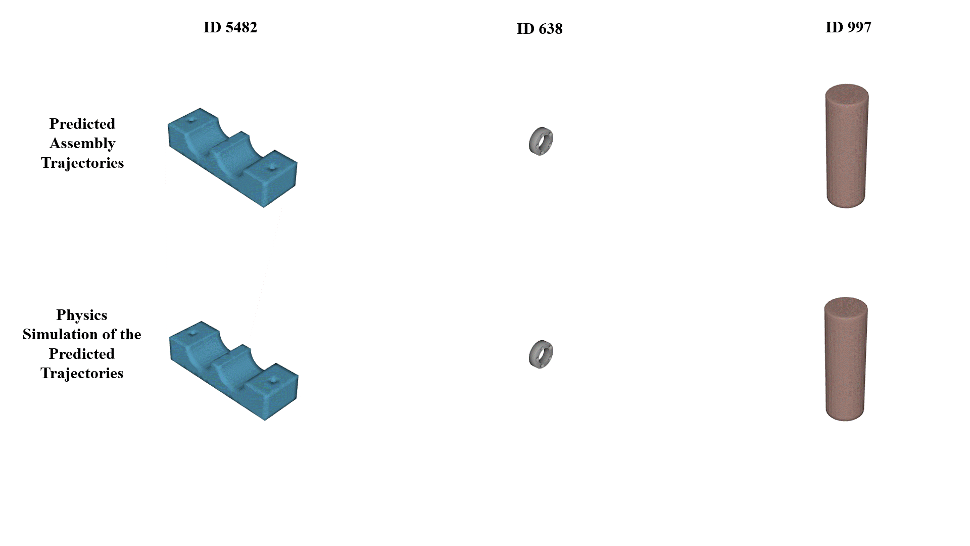 Here we show some scenarios that illustrate why a physics-engine-based evaluation is important. As is clear, some of the predictions by our AssemblyDyno model, while plausible when considering 3D point clouds, are clearly infeasible when physics is enabled. Thus, using this simulator provides a stricter evaluation of the quality of the predicted assemblies.